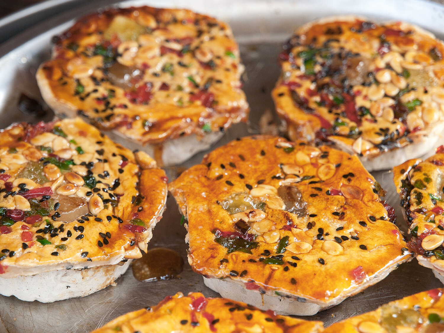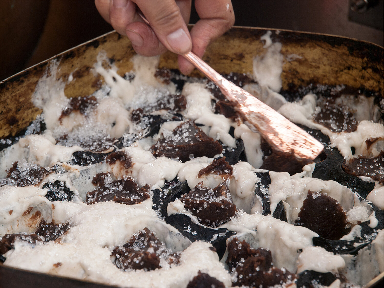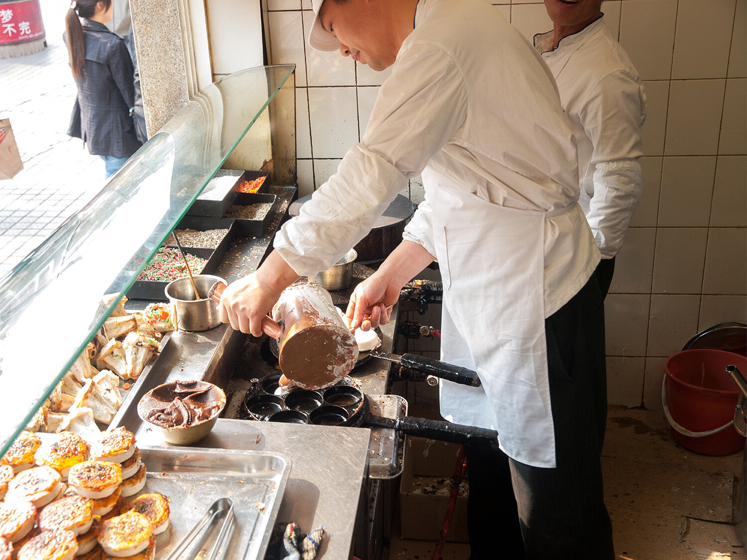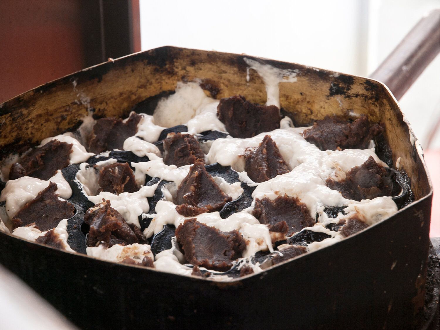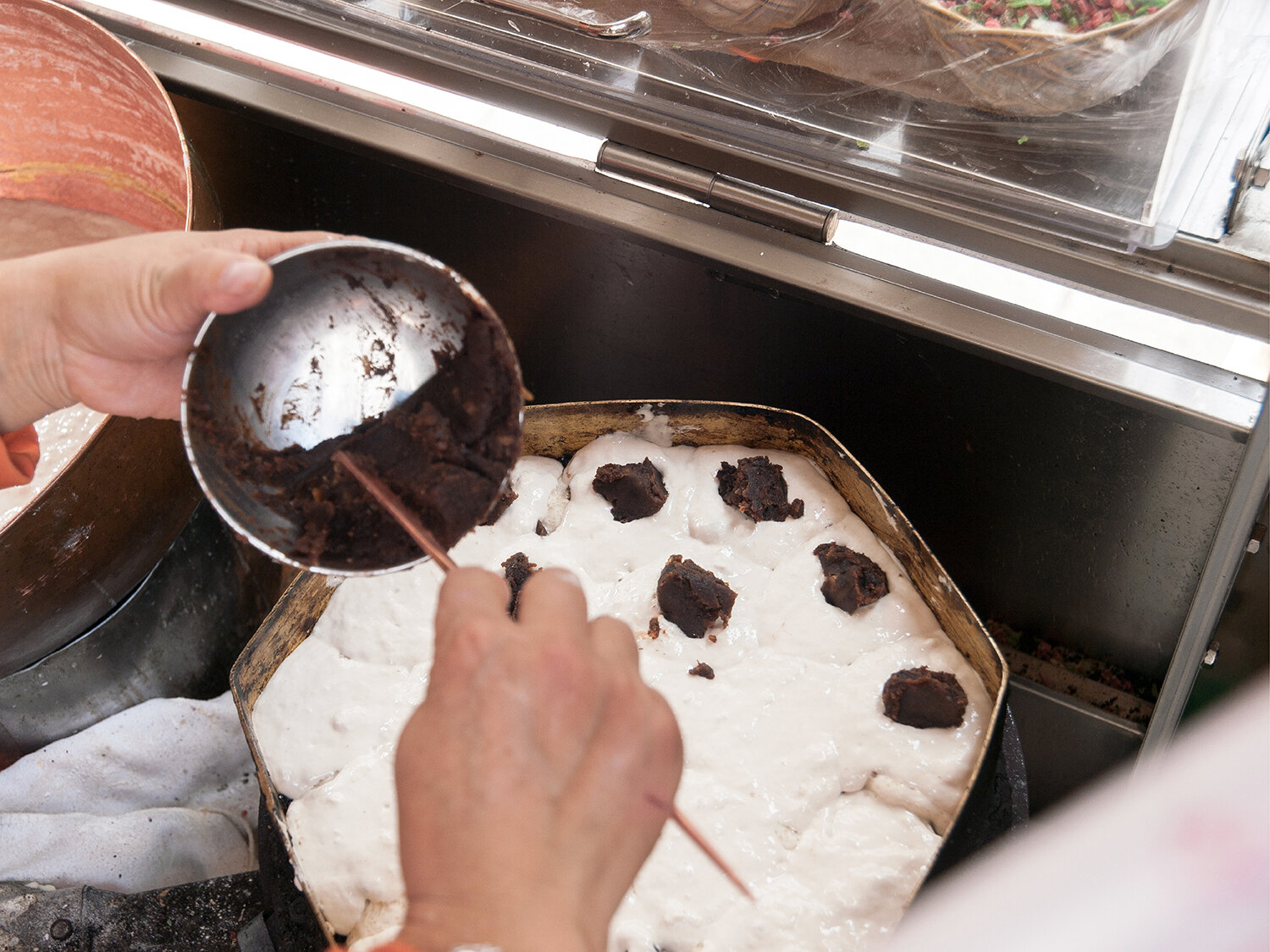 Am Ende wird der fertige Teig in spezielle, vorher mit Öl eingepinselte und auf dem Herd erhitzte gusseiserne Formen gefüllt, nach einer Weile (Gefühl!) gibt man die Bohnenpaste hinein und bedeckt das Ganze erneut mit Teig, noch eine Portion Schmalz obendrauf kann auch nicht schaden.