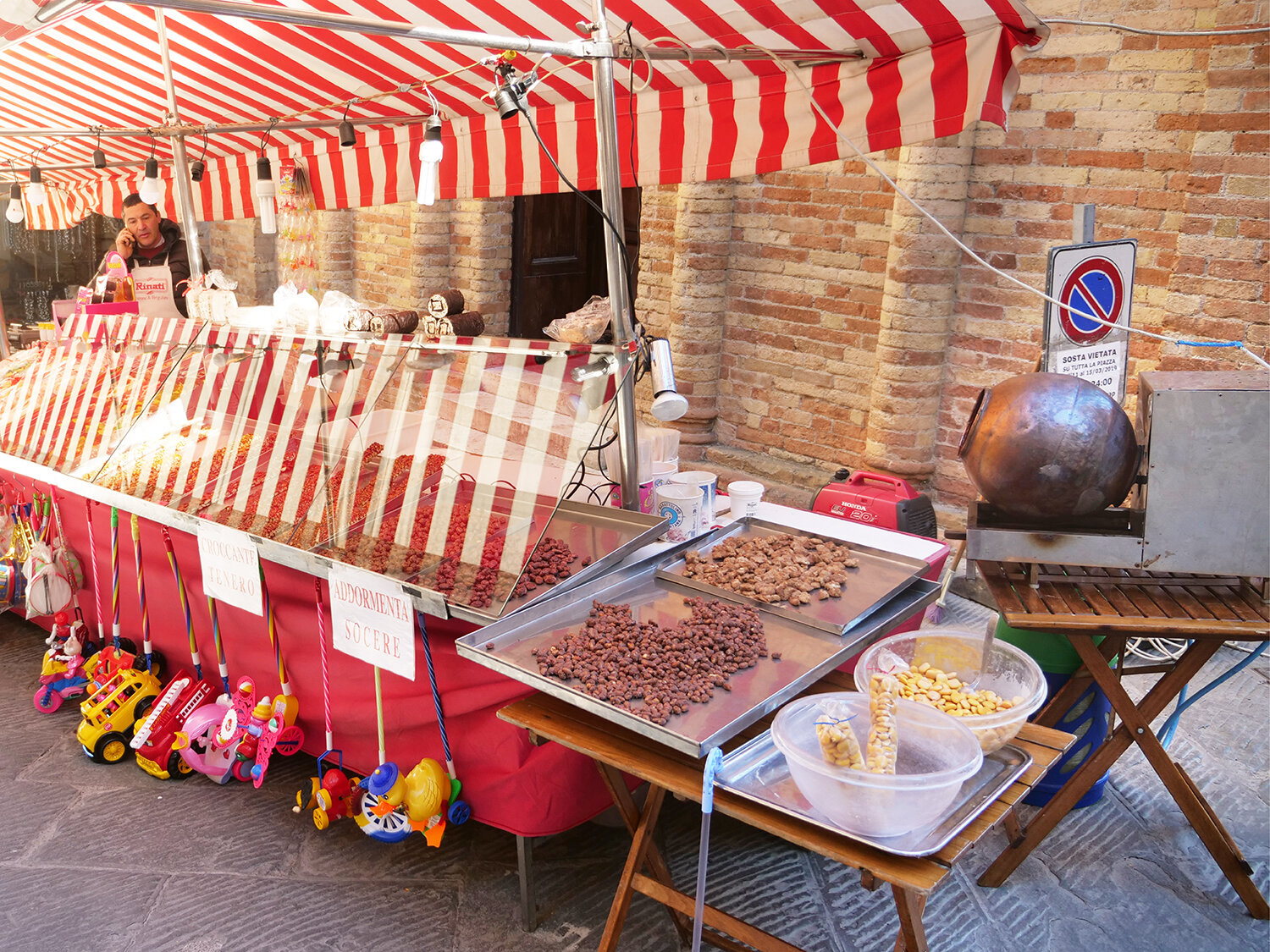 Dass es auch anders geht als nach dem patentierten Modell von Hutterer, konnte ich ebenfalls 2019 in der Toscana im Bild festhalten. Auf einem Wochenmarkt in San Gimignano fiel mir ein gasbeheizter Mandelröster auf Basis der Dragiertechnik ins Auge. Das bereits 1963 von Unternehmer Angelo Palanca im venezianischen Badia Polesine entwickelte System ist in den romanischen Ländern häufig anzutreffen.