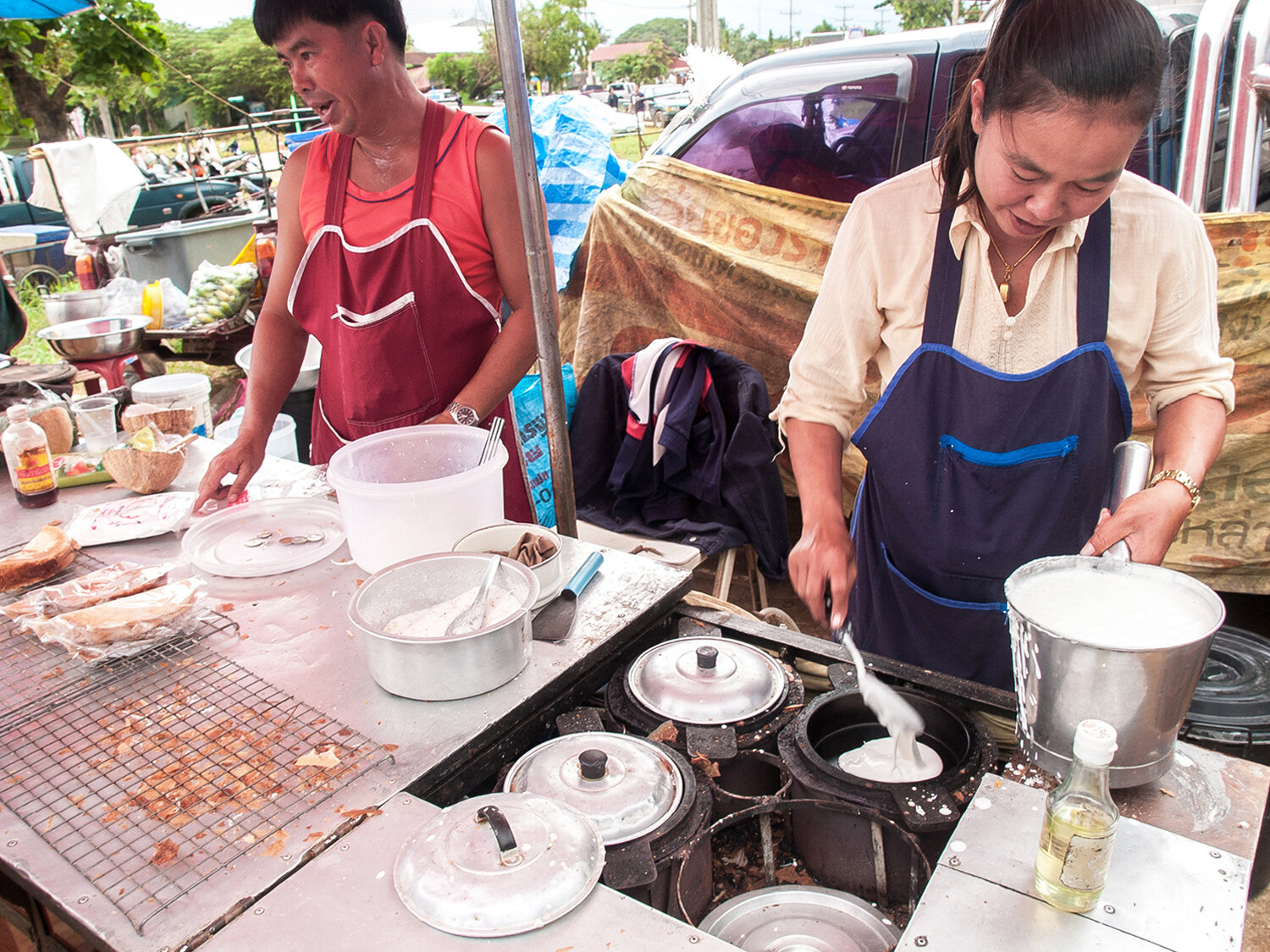 Meine erste Reise nach Thailand führte mich 2007 nach Chiang Rai in den Norden des Landes. Auf einem Markt entdeckte ich einen interessanten Snack: Khanom Thang Taek. Eine Art Pfannkuchen, dessen Zubereitung etwas Zeit in Anspruch nimmt. Ein Grund dafür, dass die Leckerei nur von wenigen Straßenverkäufern angeboten wird. Geschmack und Konsistenz sind allerdings wunderbar.