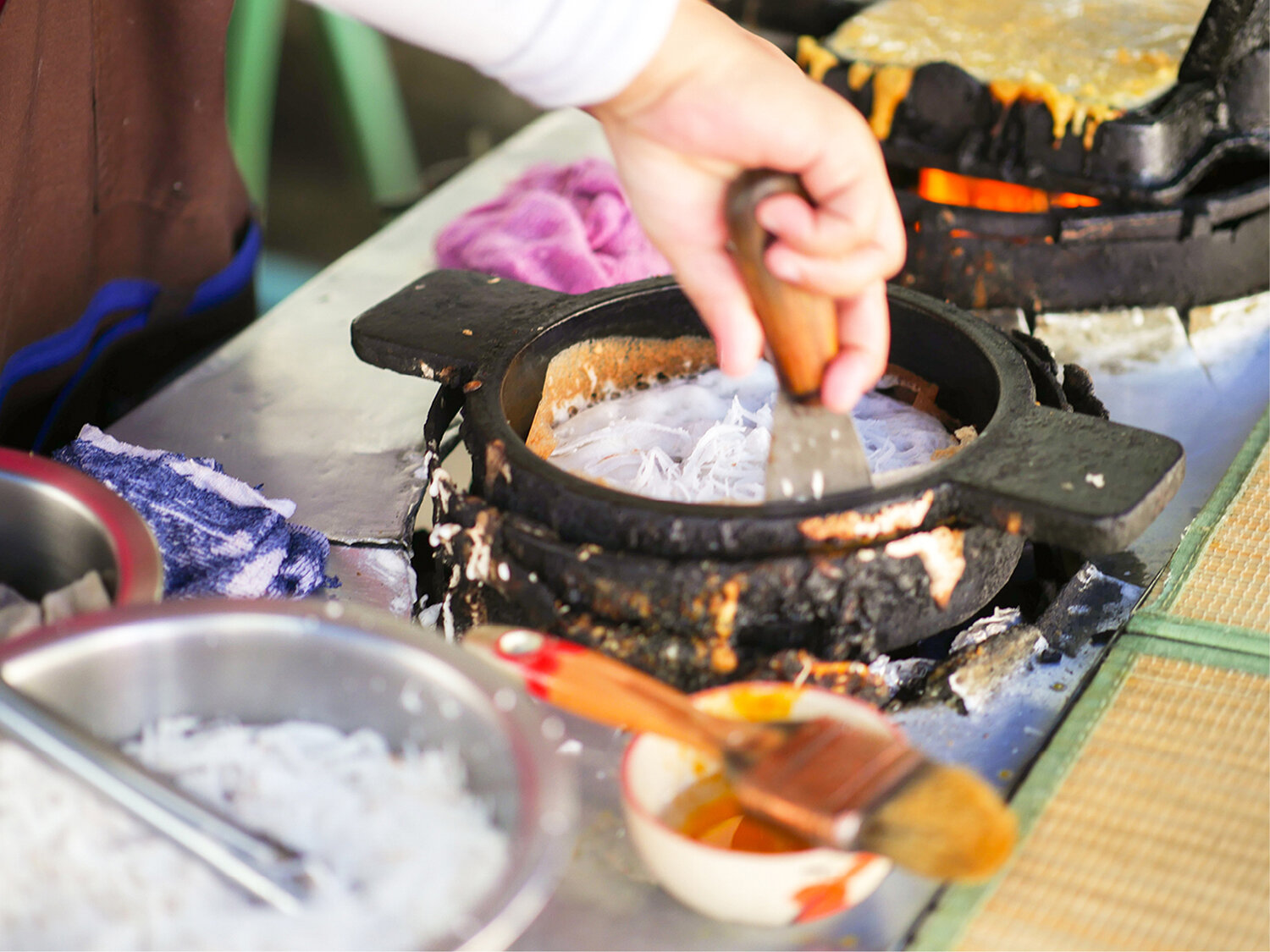 Eine Spezialität, die gelegentlich auf Märkten und auch Tempelfesten zu finden ist. Meist werden am gleichen Stand auch Waffeln angeboten. Das Besondere an diesem Pfannkuchen ist die Füllung und die zusammengeklappte Form (ähnlich einem mexikanischen Taco).