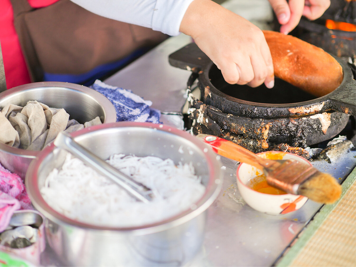 Noch während des Ausbackens im Topf werden Kokosraspeln oder weitere geschmackvolle Zutaten hinzugefügt. Mitunter auch Pandan-Saft, die „Vanille Asiens“. In Kombination mit Kokos passt das wunderbar.