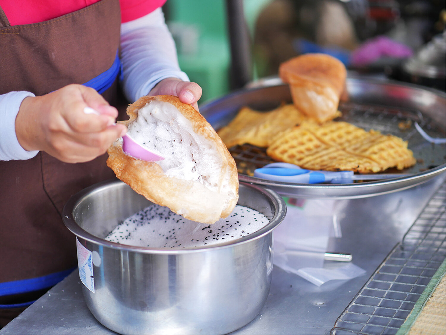 Dabei schmeckt der Teigfladen für den unbefangenen Fremdling einfach köstlich – zumal wenn zum Schluss noch zusätzlich gefüllt mit einer süßen und frischen Creme, die vorher mit schwarzem Sesam vermischt wurde.