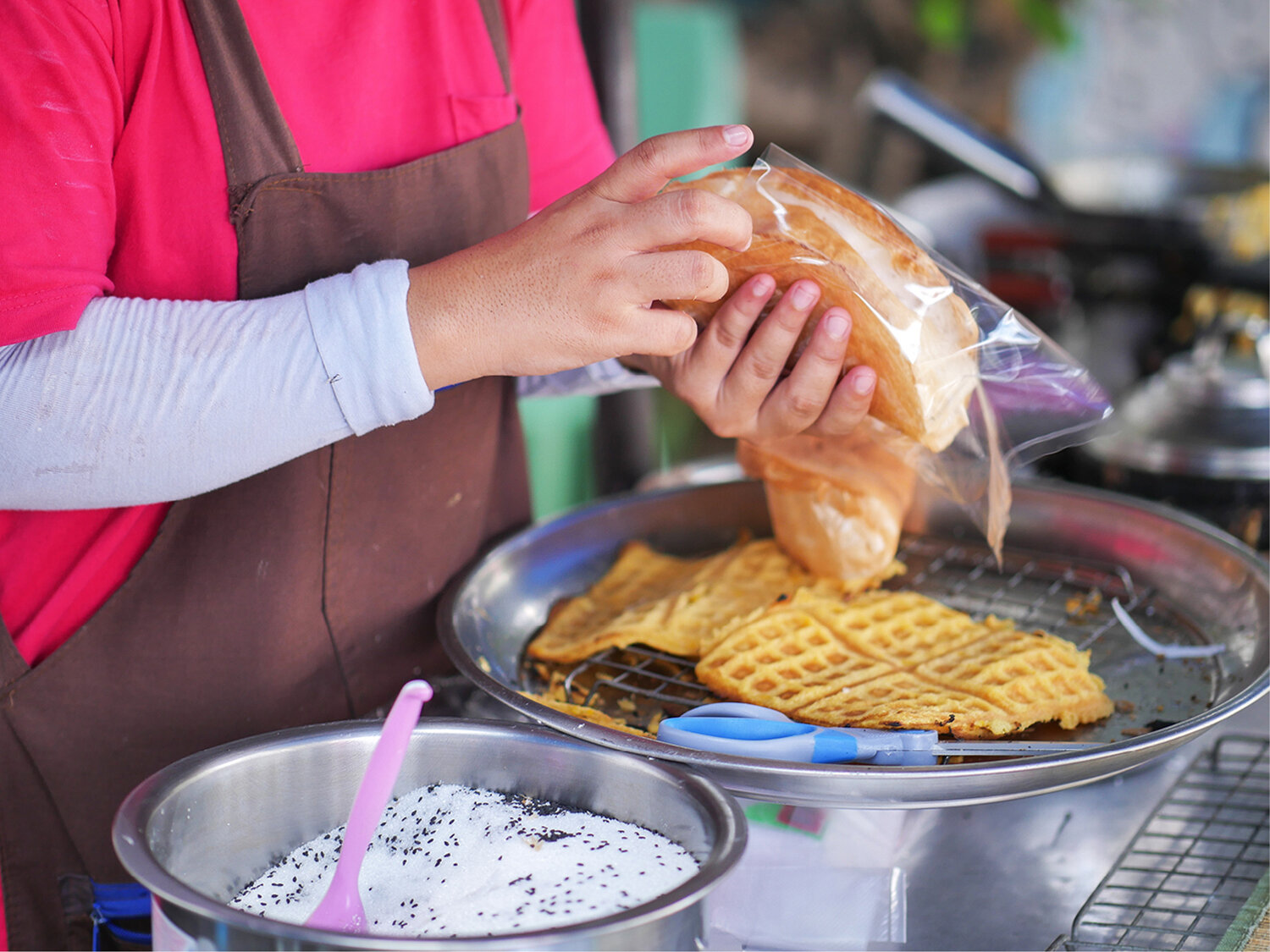 Meist wird die Leckerei gleich vor Ort genossen, man kann sie aber auch, in Folie verpackt, mit nach Hause nehmen. Wenn man solange widerstehen kann. Denn noch ofenwarm ist Khanom Thang Taek einfach unwiderstehlich!