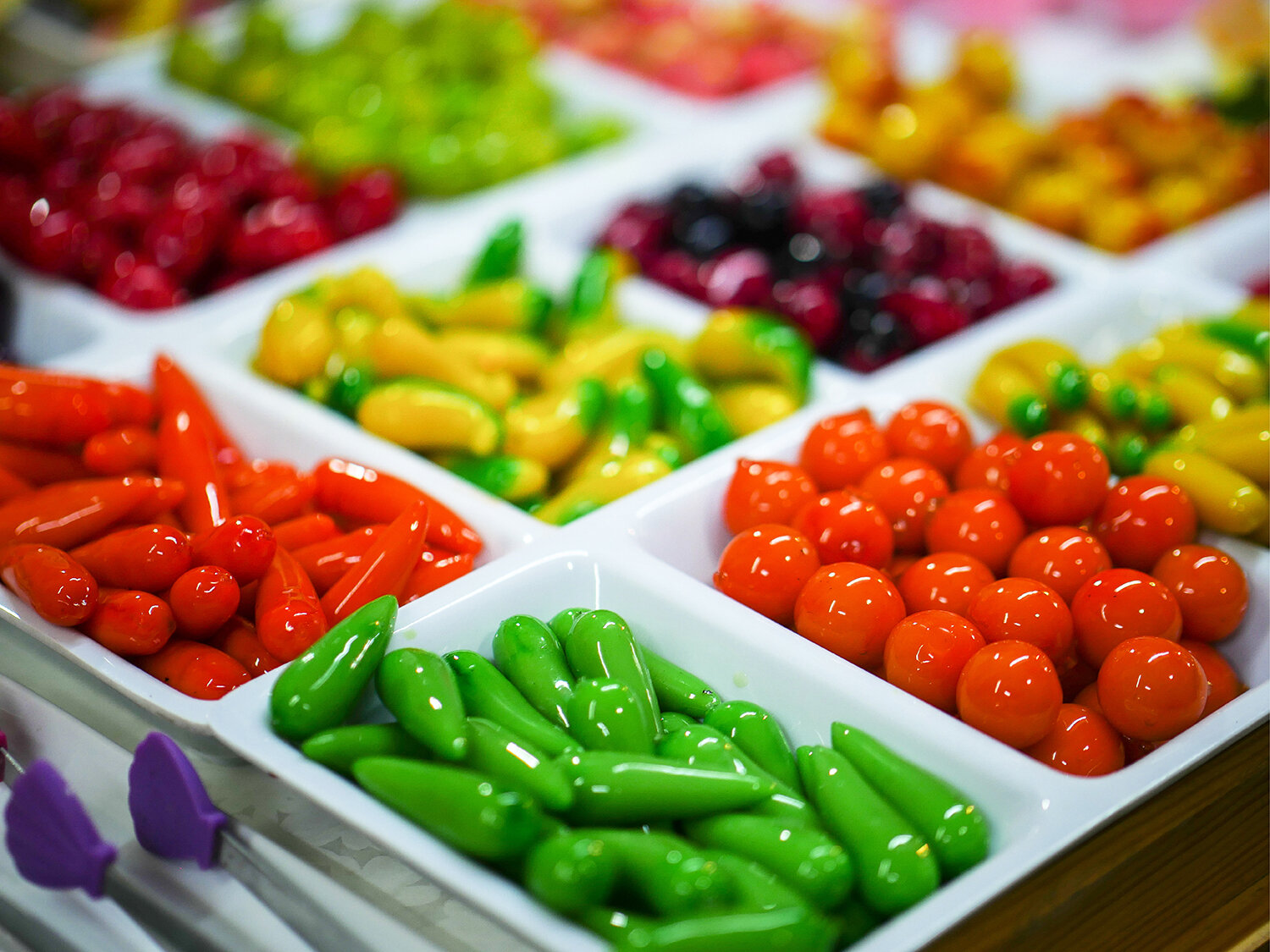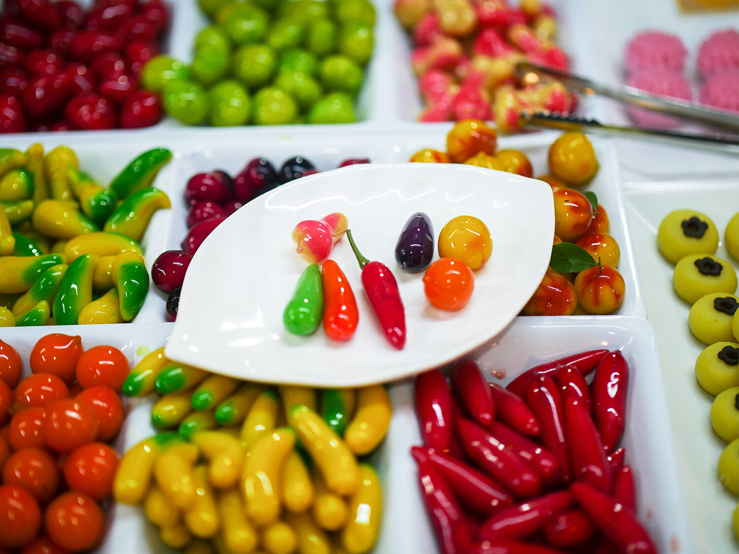 Was auf den ersten Blick aussieht wie Miniaturausgaben von Früchten wie Chilis, Kirschen, Orangen oder Mangos, Karotten oder Erdbeeren, ist – ähnlich wie unsere Marzipanfrüchte – ein mit höchstem handwerklichem Geschick gefertiges Kunstprodukt und in Thailand hoch beliebtes Dessert.