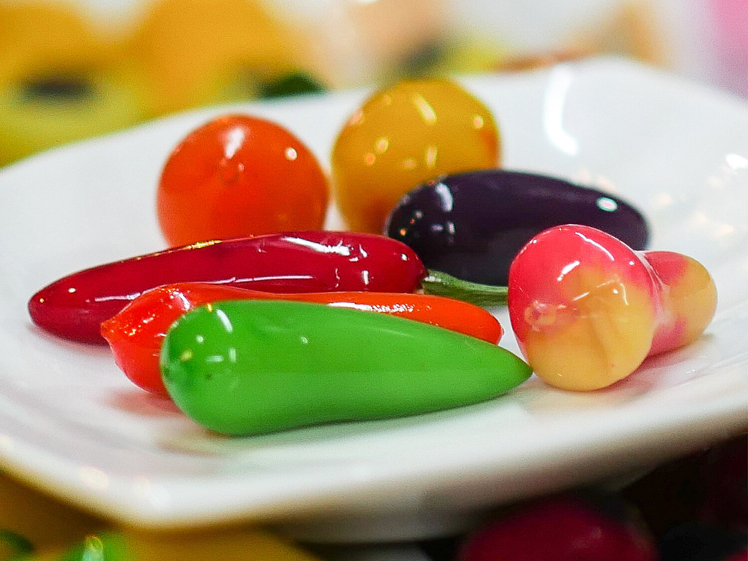 Aus der lassen sich dann mit etwas Übung und unter Zuhilfenahme eines Spachtels oder Holzstäbchens Obst und Gemüse formen, um sie anschließend mit Hilfe eines Bambusspießes in Lebensmittelfarbe zu tauchen.