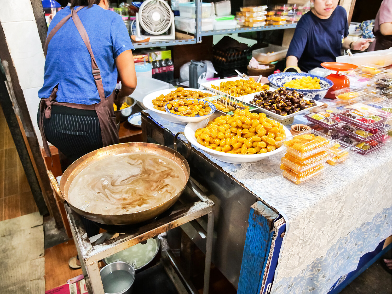 Hier entdeckte ich Luk Chup – eine süße Köstlichkeit, hergestellt aus Kokosmilch, Palmzucker, Gelierpulver, Wasser, Lebensmittelfarbe und gedämpftem Tua Tong (die gelben Kerne geschälter Mungobohnen).